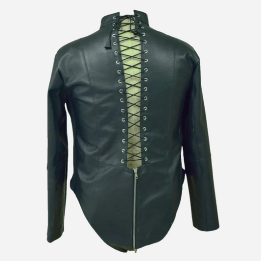 Real Leather Black Bodysuit With Zipper Details & Lace Up Back